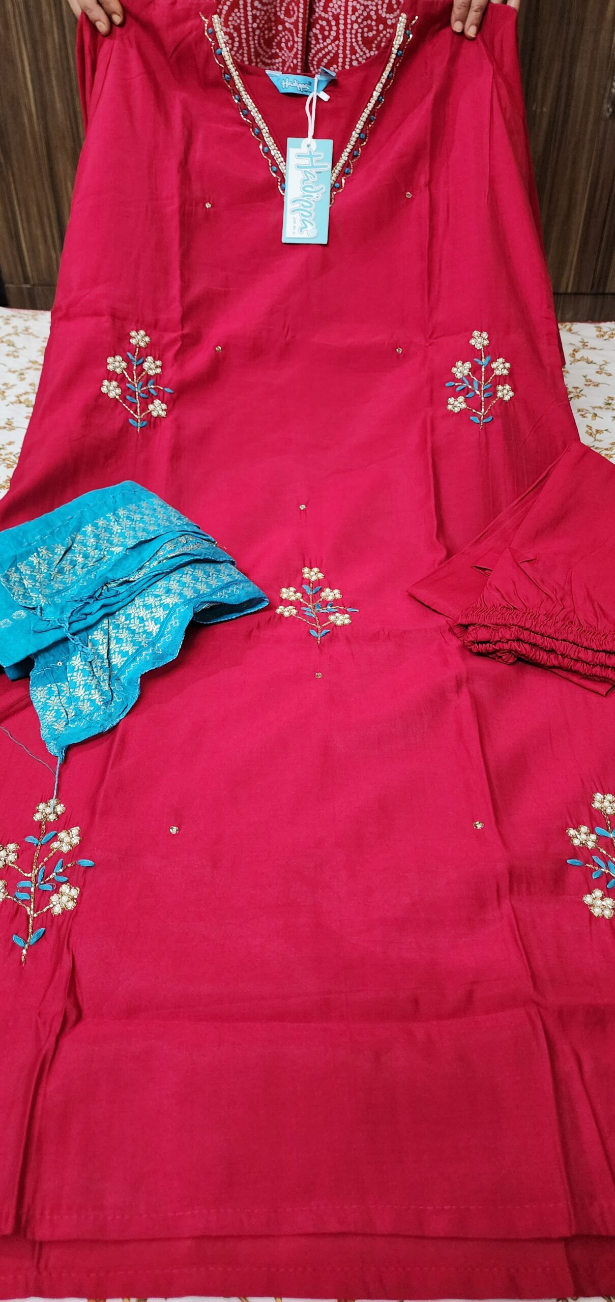 Party Wear 3 Piece Suit Set, Designer Neck Work With Pocket In Bottom